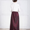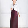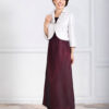 控えめな光沢が上品なジャケットは、大きめの衿で小顔効果も。短めの丈はスタイルも良く見せてくれます。