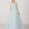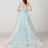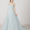 小花の装飾が可憐なビスチェにキラキラのチュールスカート、バックスタイルはフリルが華やかに流れ落ちていて女性の夢と憧れがカタチになった、そんなロマンチックな1着です。